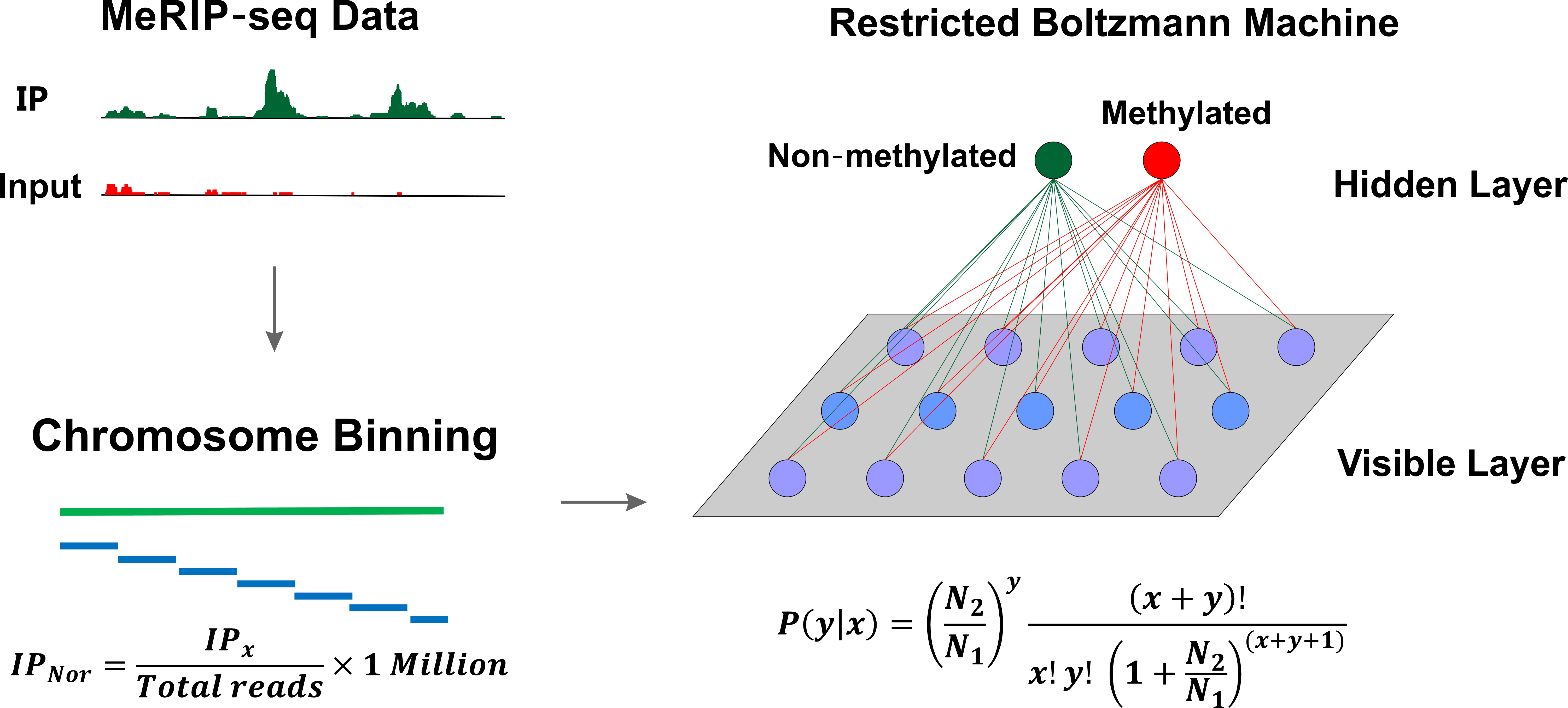 In order to identify regions that contain m6As, the algorithm first divides the entire genome into a set of mutually connected bins. According to Audic’s model, the chromosomal bins are then parameterized into a set of vectors. For m6A peak calling, the RBM model is built and trained to fit the probability distribution of the input vectors.