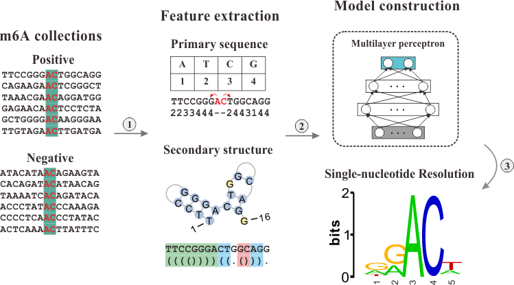 To improve the resolution for m6A peak calling, we constructed a multilayer perceptron model to predict precise m6A sites from peak regions. Combining the primary sequence and secondary structure features, a robust prediction model was built. After evaluation, the model is proved to be of accuracy larger than 85%.